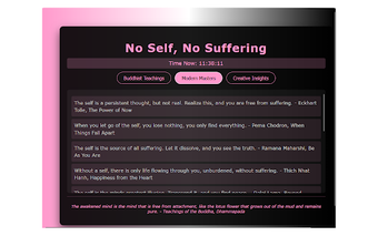 В дополнение к цитатам, расширение включает в себя часы реального времени и заметную цитату на нижней части экрана, предоставляя ежедневное вдохновение. Минималистичный интерфейс дополняется полупрозрачным черным контейнером и розовыми акцентами, создавая визуально привлекательный инструмент для практики внимательности. С поддержкой оффлайн через хранилище Chrome, Нет Я, Нет Страданий - это удобный ресурс для тех, кто ищет ежедневные напоминания о внимательности и освобождении.